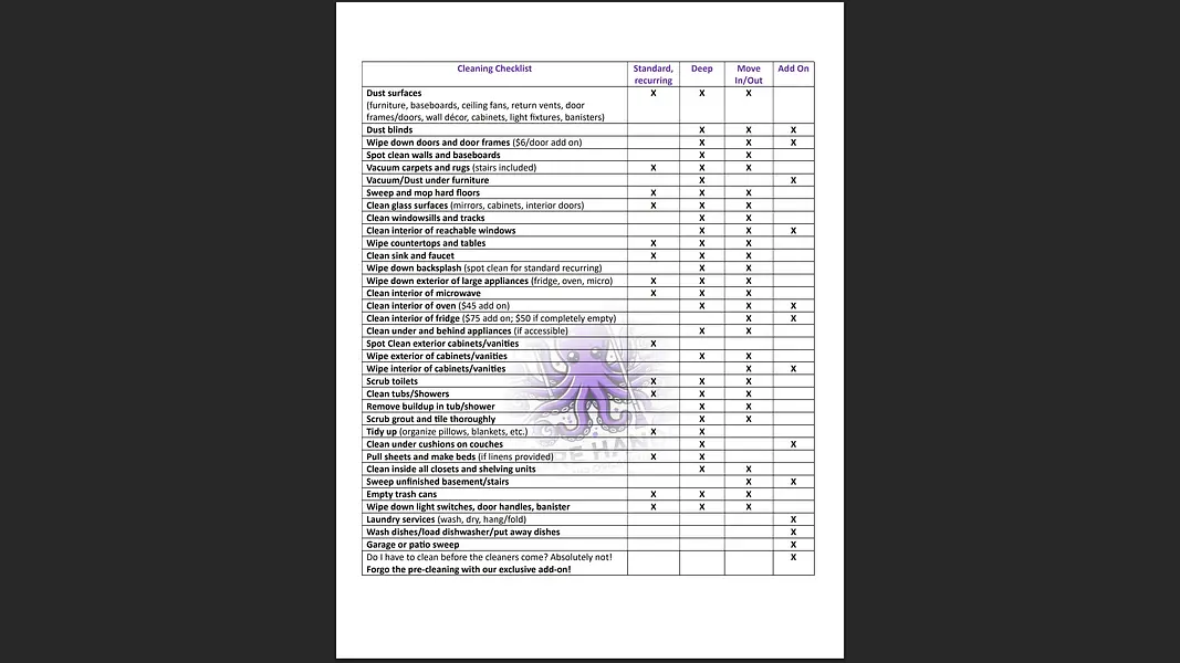 This checklist is a general guide to what we aim to cover during your clean. Some tasks may vary depending on the frequency, space, or type of service you booked. If something poses a safety risk or is not part of the scheduled service, we might skip it. If you let us know your priorities ahead of time and we'll do our best to make it happen.